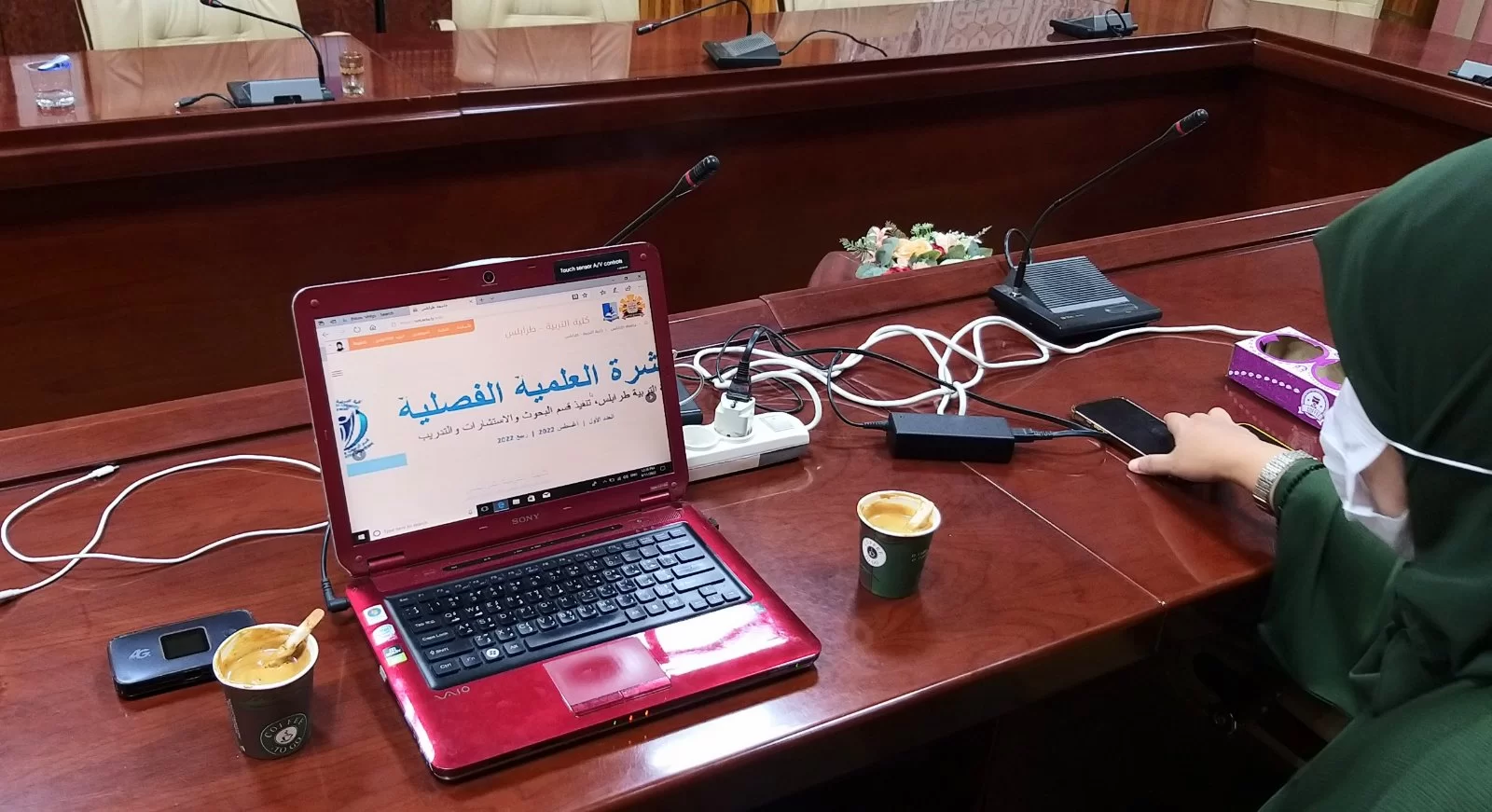 إدارة المكتب تتوجّه بالشكر لأستاذة إبتسام على إلتزامها بالحضور، ونسأل الله أن يعينها في أداء مهامها والقيام بمسؤلياتها تجاه قسمها ونثني على استعدادها للقيام بما يفيد قسمها وإلقاء الضوء على أبرز أخباره ونشاطاته.