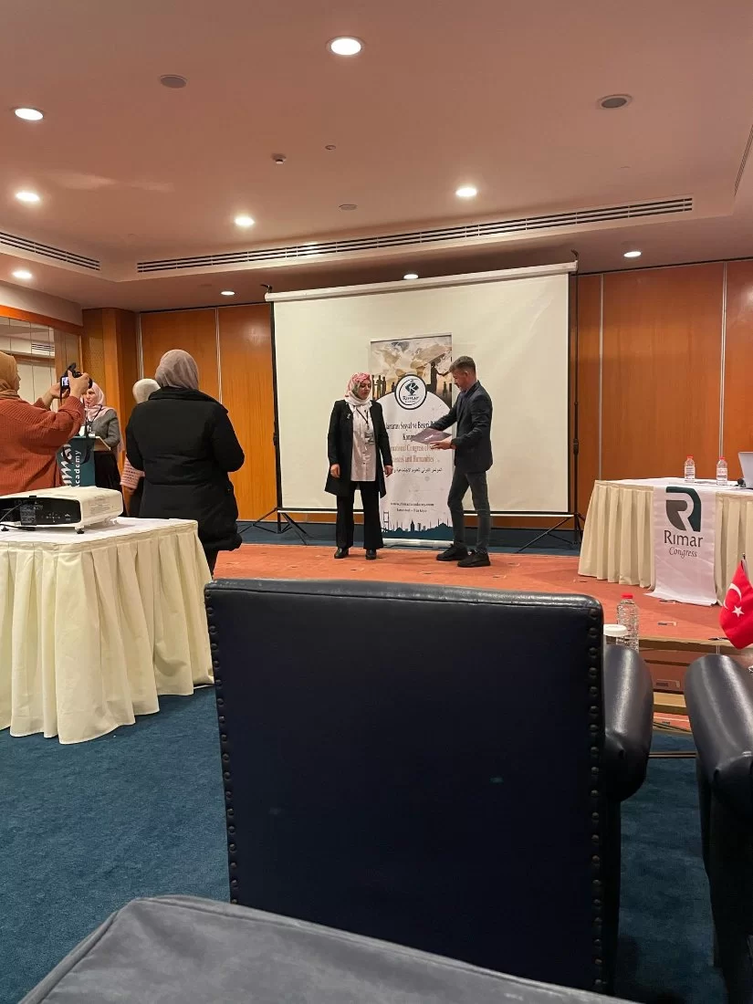 مشاركة الدكتوره نجاة الغول بورقه بحثيه في المؤتمر الدولي للعلوم الإجتماعية والإنسانية الذي عقدته أكاديمية ريمار بالتعاون مع جامعة ماردين أرتوكلوا وجامعة إغدير في اسطنبول / تركيا .بعنوان : ( أهمية البحوث العلمية الإجرائية في علم الإجتماع والخدمة الإجتماعية ).وقد تحصلت على وسام