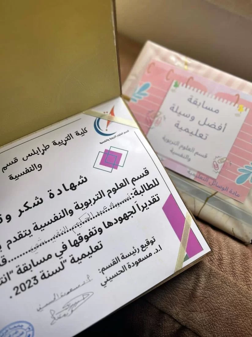 حصول الطالبة : نسيبة عبد الحكيم أبو شعفة النفيشي” في مسابقة “أنتاج أفضل وسيلة تعليمية وتربوية” على جائزة أفضل وسيلة تعليمية على مستوى كلية التربية طرابلس والتي ينظمها قسم العلوم التربوية والنفسية، على مستوى الكلية، للفصل الدراسي خريف 2023م. وشاركت الطالبة بوسيلة تعل