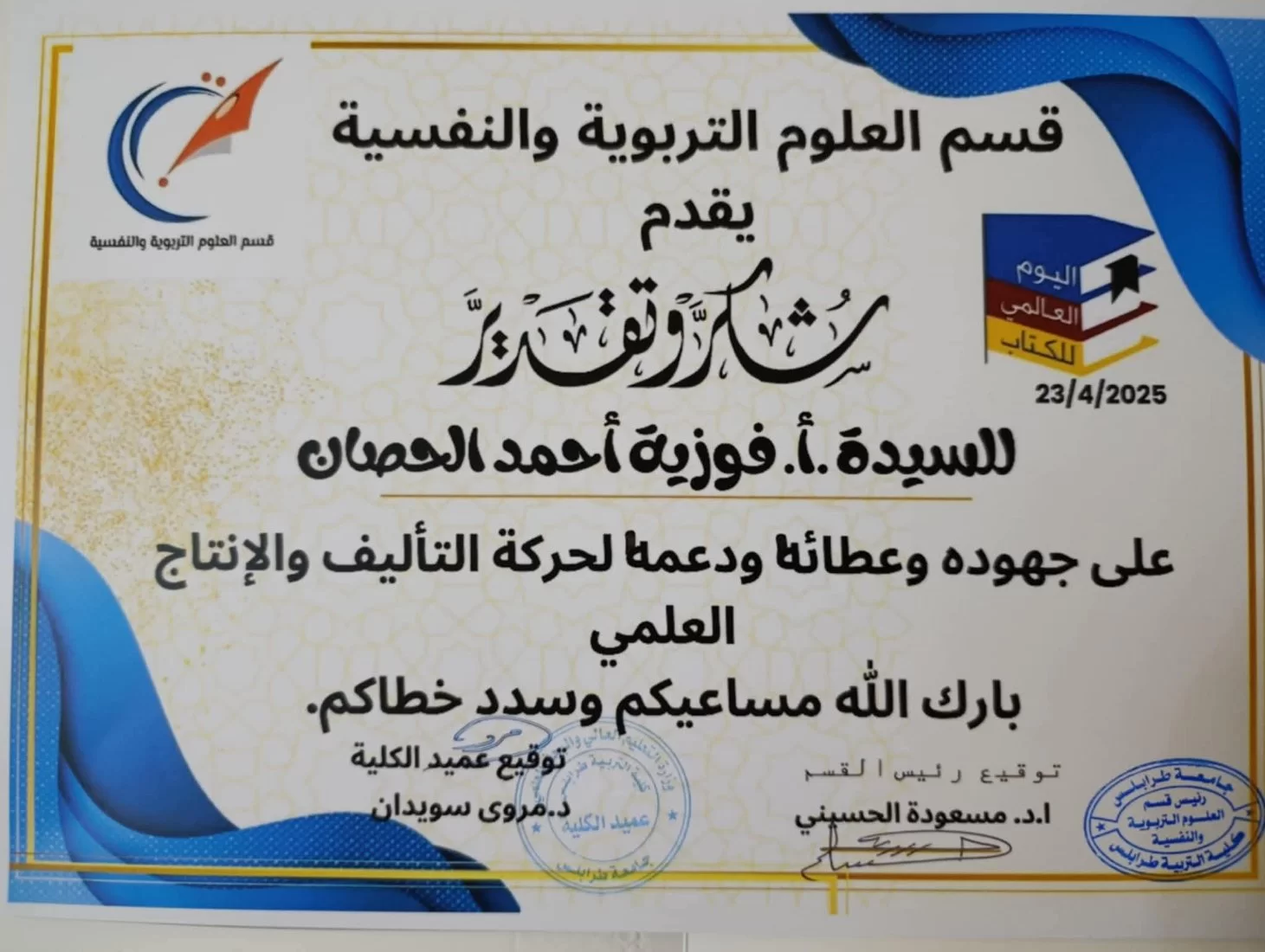 حضور فاعل وتكريم للأستاذة فوزية الحصان في حوارية علمية بمناسبة اليوم العالمي للكتاب