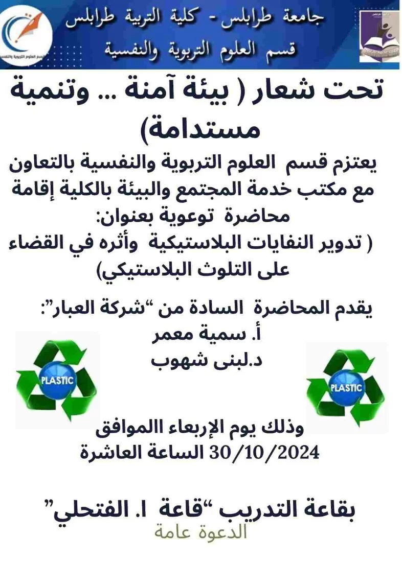 محاضرة توعوية بعنوان (تدوير النفايات البلاستيكية وأثره في القضاء على التلوث البلاستيكي) وتحت شعار