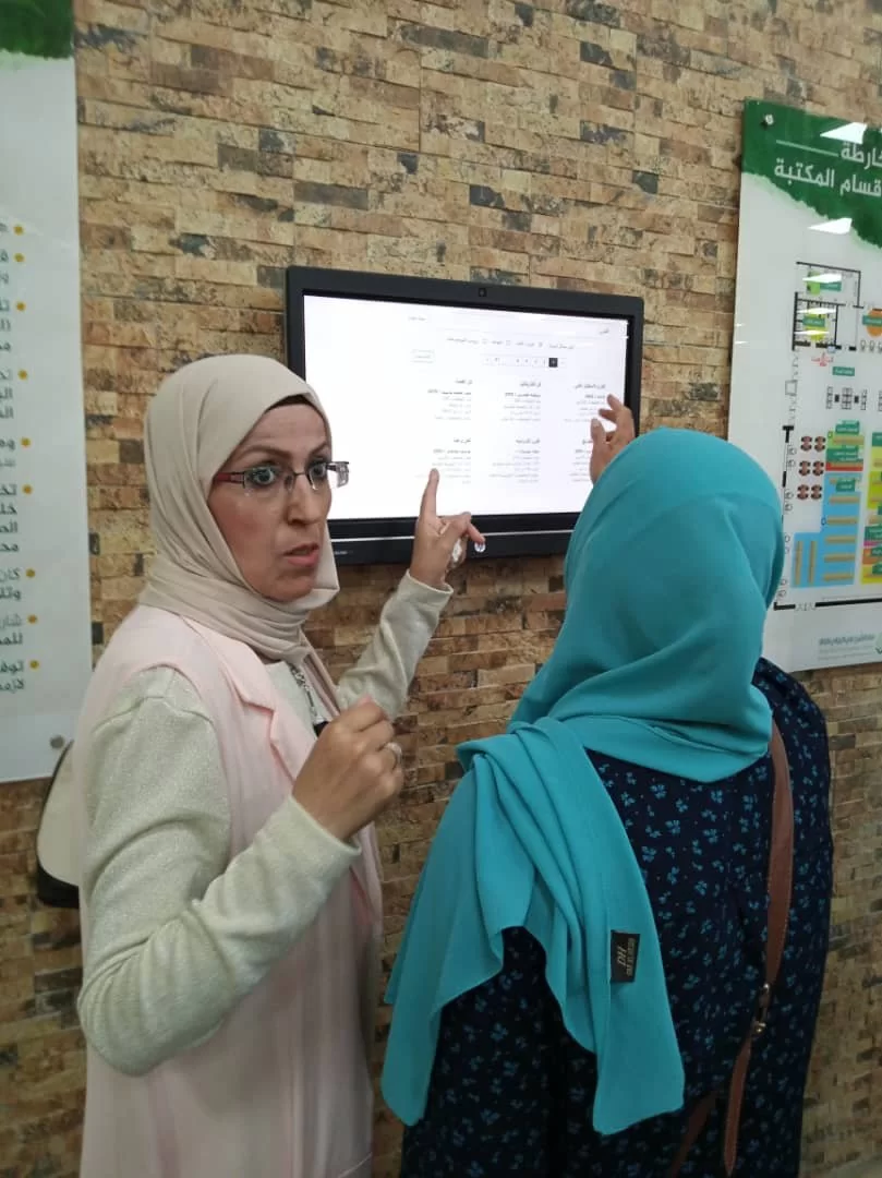 أخذنا الأستاذ هشام بعد ذلك في جولة داخل المكتبة بدأها بكيفية البحث عن الكتب عبر شاشة إلكترونية متقدمة راقية سريعة حديثة دقيقة وسهلة الاستعمال، فما على الباحث سوى طباعة اسم الكتاب اوالمؤلف لتظهر على الشاشة، وفي ثوان معدودة، مئات المصادر والمراجع ذات العلاقة بالبحث، مرقمة حسب ترقيم ديوي العشري.