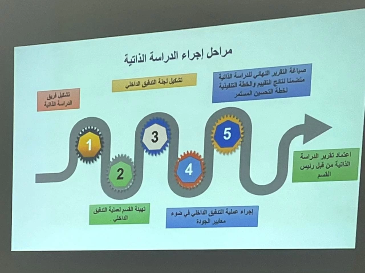 ورشة تنفيذ الدراسة الذاتية.في اطار استعداد برنامج العلوم التربوية والنفسية للتقدم بطلب الاعتماد البرامجي من مركز ضمان جودة المؤسسات التعليمية والتدريب ومن منطلق استعداده لتنفيذ الدراسة الذاتية المحددة بتاريخ 25/5/2024. عقد قسم العلوم التربوية والنفسية اليوم الإثنين 13/5/2024 ورشة تدريبية عن كيفية تنفيذ الدراسة الذاتية والتدقيق الذاتي قدمتها الأستاذة فوزية أحمد الحصان رئيسة قسم الجودة وتقييم الأداء بالكلية وقد حضرها كافة أعضاء اللجان الرئيسية والفرعية التي تم تسميتها في الإجتماع الأول لفريق الدراسة الذاتية المنعقد بتاريخ 5/5/2024 حيث كان أهداف الورشة النقاط الجوهرية التالية:1. التعرف على المفاهيم والمبادئ المتعلقة بالدراسة الذاتية.2. تنمية مهارات منتسبي البرنامج على إجراء التدقيق الداخلي.3. معرفة معايير الاعتماد التي تبنى على أساسها التدقيق الداخلي.4. تنمية قدرة البرنامج على التمييز بين مكونات التقرير النهائي لوثيقة الدراسة الذاتية. 5. التعرف على مراحل إجراء الدراسة الذاتية.6. التمكن من تطبيق مراحل وخطوات اجراء الدراسة الذاتية. 7. التمكن من كتابة التقرير النهائي للدراسة الذاتية.كل الشكر والتقدير لأعضاء اللجان على حضورهم والتزامهم وجزيل الشكر للأستاذة فوزية الحصان على جهودها ونسأل الله التوفيق للجميع.