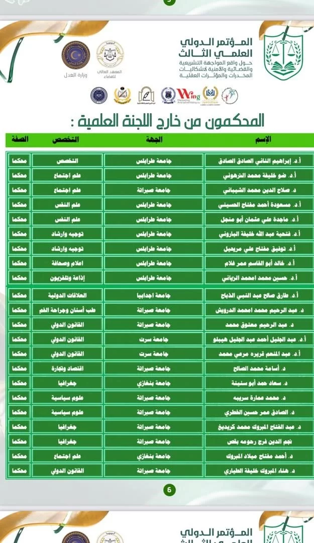 بدعوة كريمة من معالي وزيرة العدل السيدة حليمة إبراهيم، والسيد المستشار ضياء الدين المختار خماج مدير عام المعهد العالي للقضاء ومشرف عام المؤتمر الدولي الثالث حول "واقع وتحديات المواجهة التشريعية والقضائية والأمنية لاشكاليات المخدرات والمؤثرات العقلية" المنعقد بتاريخ 24/11/2025 بقاعة المؤتمر بالمعهد العالي للقضاء، شارك كوادر قسم العلوم التربوية والنفسية في تحكيم وإدارة الجلسات بالمؤتمر :