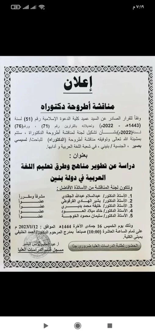 في يوم الخميس 12-01-2023 ناقش دكتورنا الكريم أطروحة دكتوراه، تقدم بها الباحث "ليسيسي بصير" من جمهورية بنين. الأطروحة بعنوان "دراسة عن تطوير مناهج وطرق تدريس اللغة العربية في دولة بنين."،
