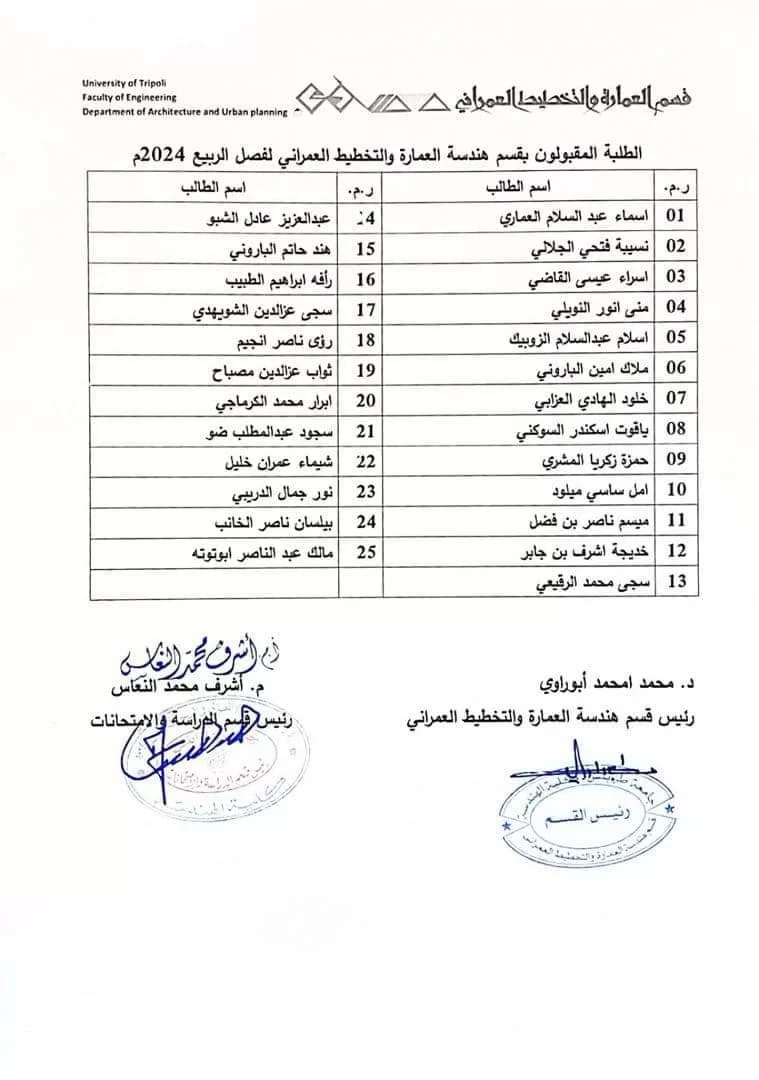 نقدم لكم قائمة باسماء الطلبة المقبولين بقسم العمارة والتخطيط العمراني لفصل ربيع 2024... نسأل الله لهم التوفيق في مسيرتهم التعليمية بالقسم.