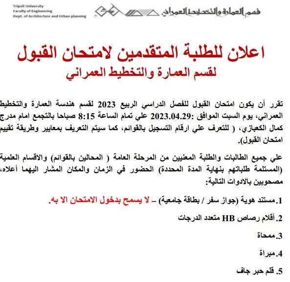يعلن قسم هندسة العمارة والتخطيط العمراني بان موعد امتحان القبول سيكون يوم السبت الموافق 2023/4/29 صباحا على تمام الساعة الثامنة والنصف صباحا.
