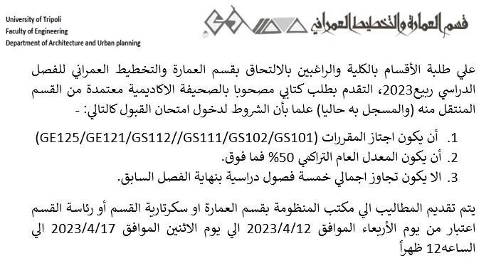 يعلن قسم هندسة العمارة والتخطيط العمراني عن قبول طلبات التقدم لامتحان القبول بالقسم لطلبة الأقسام وتقديم المتطلبات المذكورة في الاعلان.