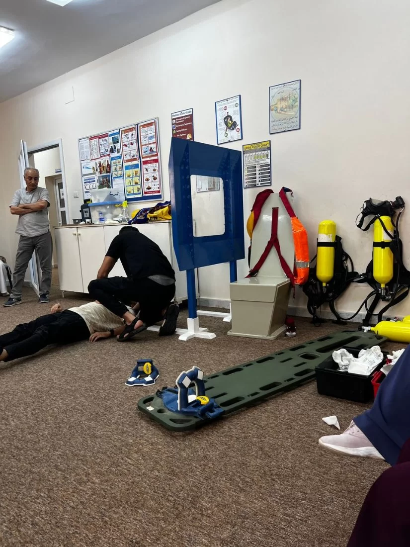 في ضوء تطبيق العملي لمادة السلامة البحرية قام طلبة قسم الهندسة البحرية والمنصات العائمة بإجراء تطبيق عملي بما تم دراسته من اسعافات أولية ومكافحة الحرائق ومعدات السلامة علي ظهر السفن والمنصات العائمة وذلك تم في مركز السلامة البحرية في منطقة نجيلة حيث أجرو تجارب محاكاة لعملية إخلاء علي ظهر السفن وعملية مكافحة الحرائق و ايضا الانقاذ البحري بالاضافة الي تطبيق عملي للإسعافات الأولية وكيفية التعامل معاها في حالة حدوث الكوارث والحرائق علي ظهر السفن.