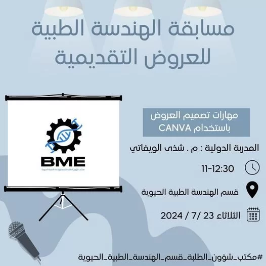 بحضور المشاركين في مسابقة الهندسة الطبية للعروض التقديمية انطلقت أول ورشة عمل بعطاء المدربة الدولية م.شذى الويفاتي ضمن المرحلة التحضيرية للمسابقة ، هذه المسابقة من تنظيم مكتب شؤون الطلبة بقسم الهندسة الطبية الحيوية بالتعاون مع قسم الهندسة الطبية الحيوية
