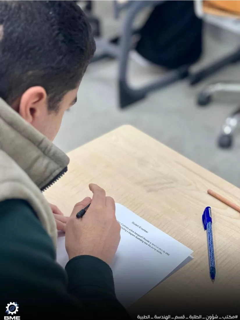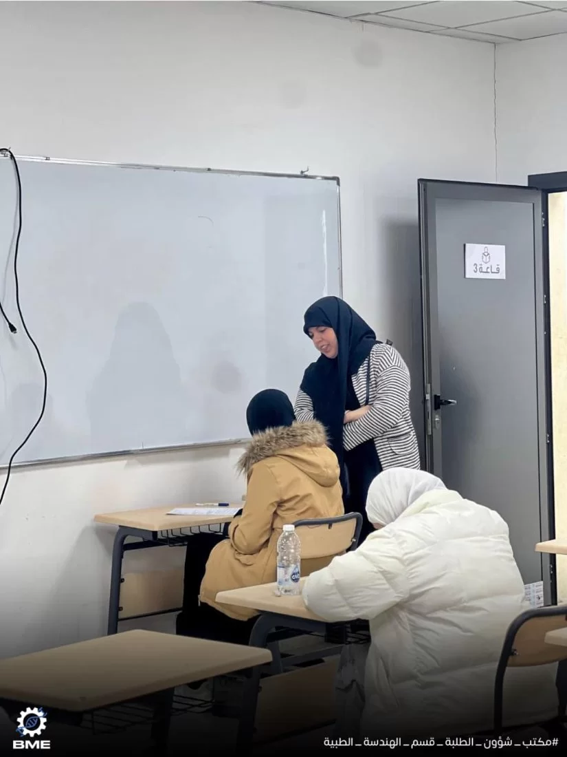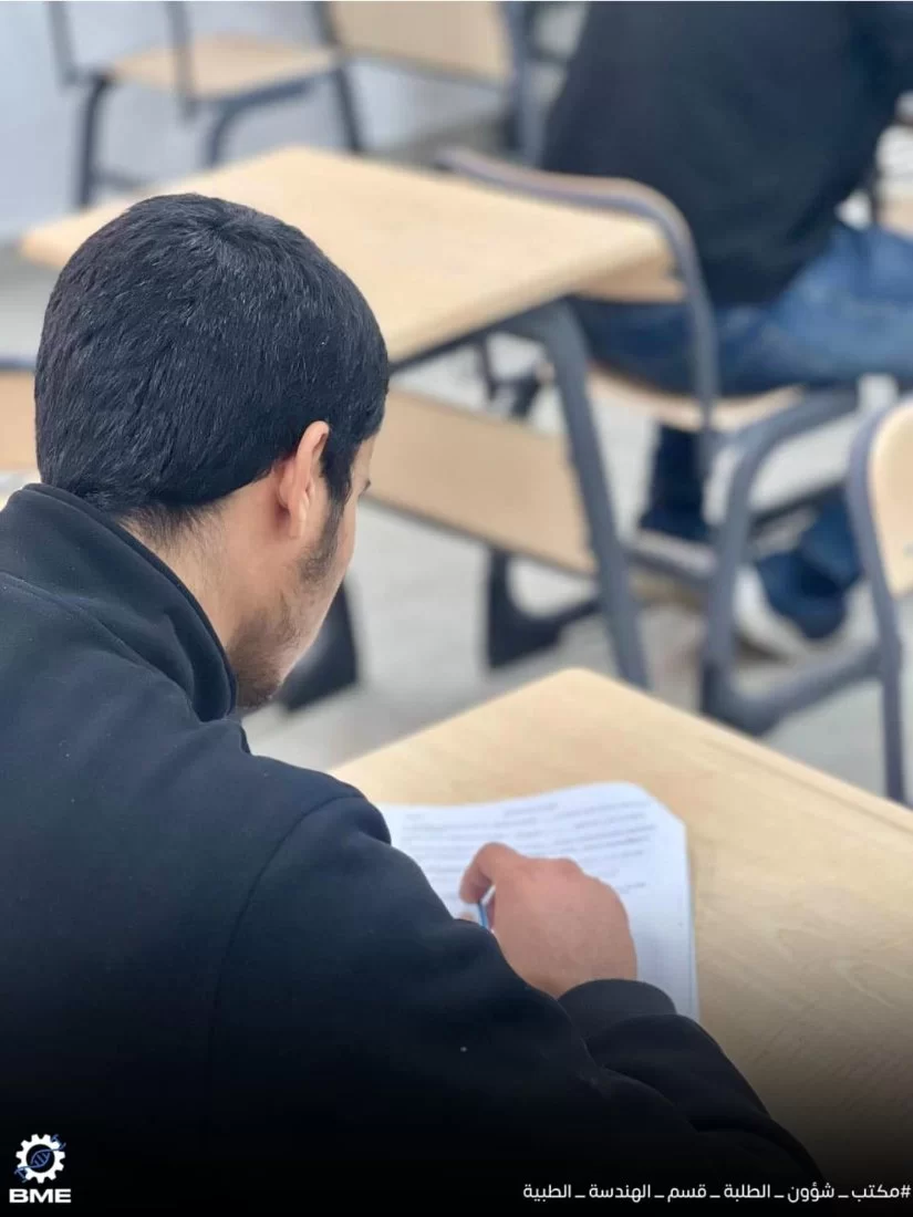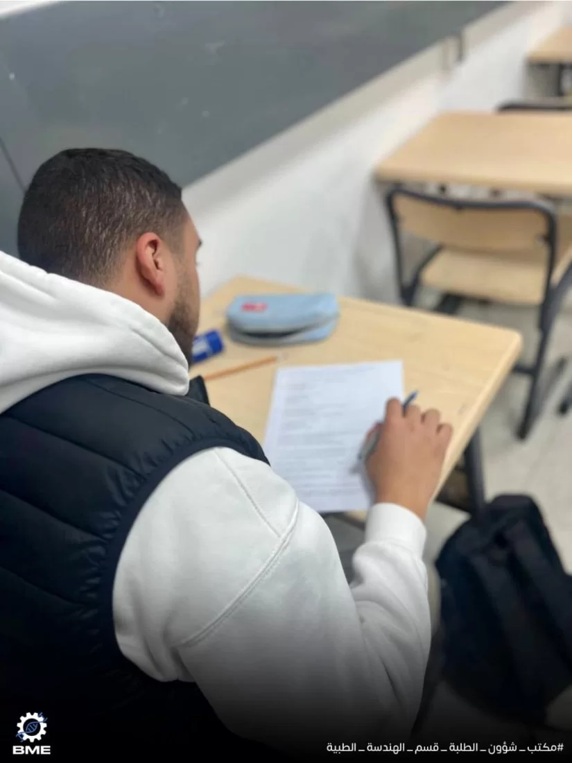 متابعة سير الامتحانات النصفية الثانية لطلبة قسم الهندسة الطبية الحيوية خريف 2024.انطلقت الامتحانات النصفية الثانية بقسم الهندسة الطبية الحيوية الأحد الموافق 15/12/2024 ولا تزال مستمرة طوال الأسبوع الجاري ، نتمنى لجميع الزملاء التوفيق في الامتحانات وأن تكون النتائج مبشّرة للجميع .