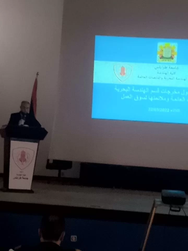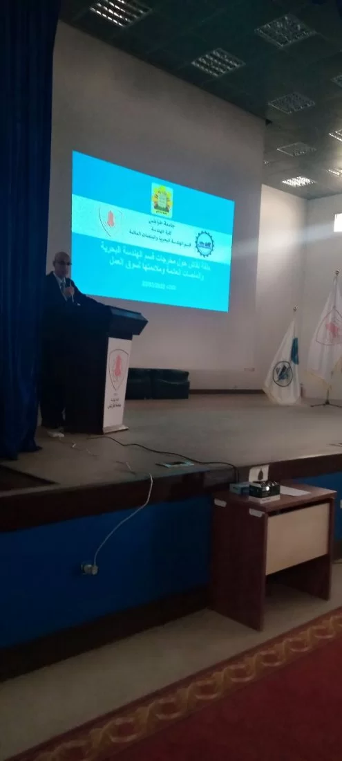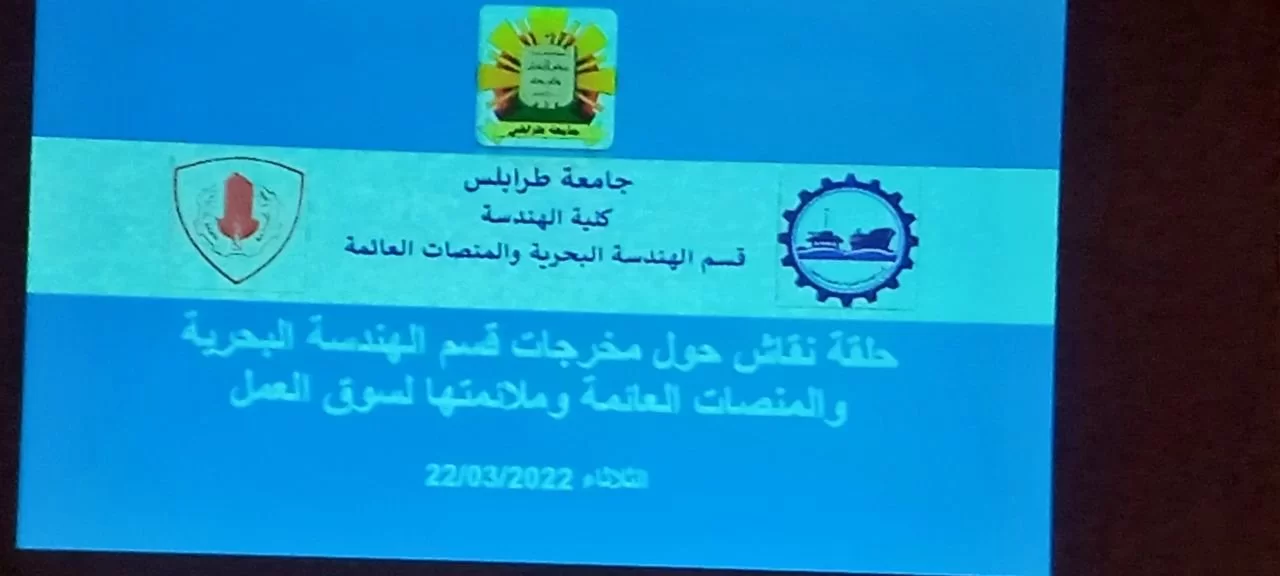 أقام قسم الهندسة البحرية اليوم الثلاثاء على تمام الساعة 10:00 صباحاً بمسرح كلية الهندسة بجامعة طرابلس حلقة نقاش بعنوان (سبل التعاون والتكامل بين القسم والمؤسسات البحرية) بمشاركة العديد من الجهات ذات العلاقة ومنها مصلحة المؤاني وحضر الورشة كل من رئيس الجامعة الدكتور خالد محمد عون والسادة الضيوف من مصلحة المواني ومن الأكاديمية البحرية، وكان برنامج الورشة كالتالي: كلمة الافتتاح من قبل رئيس القسم الدكتور محمد ضو، ثم كلمة من قبل رئيس الجامعة، والعرض التقديمي حول القسم ، بعد ذلك جلسة حوراية برائسة الدكتور فتحي ابوصاع والكتور نوري الشول تضمن المحاور التالية: