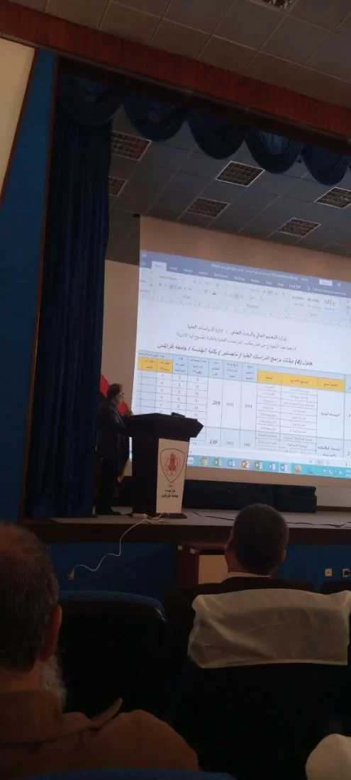 فى اطار المجهودات التى تبدلها ادارة الدراسات العليا بوزارة التعليم العالي والبحث العلمى قامت اللجنة المشكلة بقرار وزير التعليم العالى بخصوص تقييم برامج الدراسات العليا بجامعة طرابلس بمباشرة مهامها وبعد استقبال السيد رئيس الجامعة المكلف لها بمكتبه والترحيب بهم فى رحاب جامعة طرابلس انتقلت الى كلية الهندسة حيث تم اجراء عرض قدمه السيد عميد كلية الهندسة بمسرح الكلية حول برامج الدراسات العليا بالكلية وبحضور رئيس الجامعة المكلف ومدير ادارة الدراسات العليا بالوزارة ووكيل الجامعة للشؤون الطبية والعميد المكلف لكلية العلوم ومدير ادارة الدراسات العليا بالجامعة والسيدة وكيل الكلية للشؤون العلمية والسادة منسقى الدراسات العليا باقسام الكلية.... بعدها انتقلت اللجنة الى قاعة الاجتماعات الرئيسية لكلية الهندسة للاجتماع بمنسقى الدراسات العليا للاقسام العلمية لمناقشة وضع برامج الدراسات العليا وتاريخ منح الاذن لها والتاكد من توفر الشروط للبرامج المستحدثة... واستمر عمل اللجنة الى الساعة الثالثة بعد الظهر حتى تم استكمال متابعة وتقييم كل البرامج..