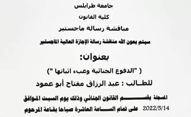 مناقشة رسالة ماجستير بقسم القانون الجنائي