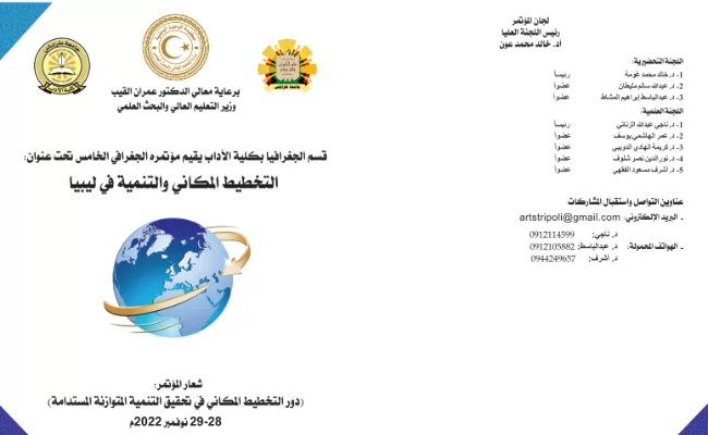 كلية الآداب - قسم الجغرافيا ونظم المعلومات الجغرافية يقيم مؤتمره العلمي الخامس حول التخطيط والتنمية المكانية في ليبيا 28/ نوفمبر الى 29/ نوفمبر