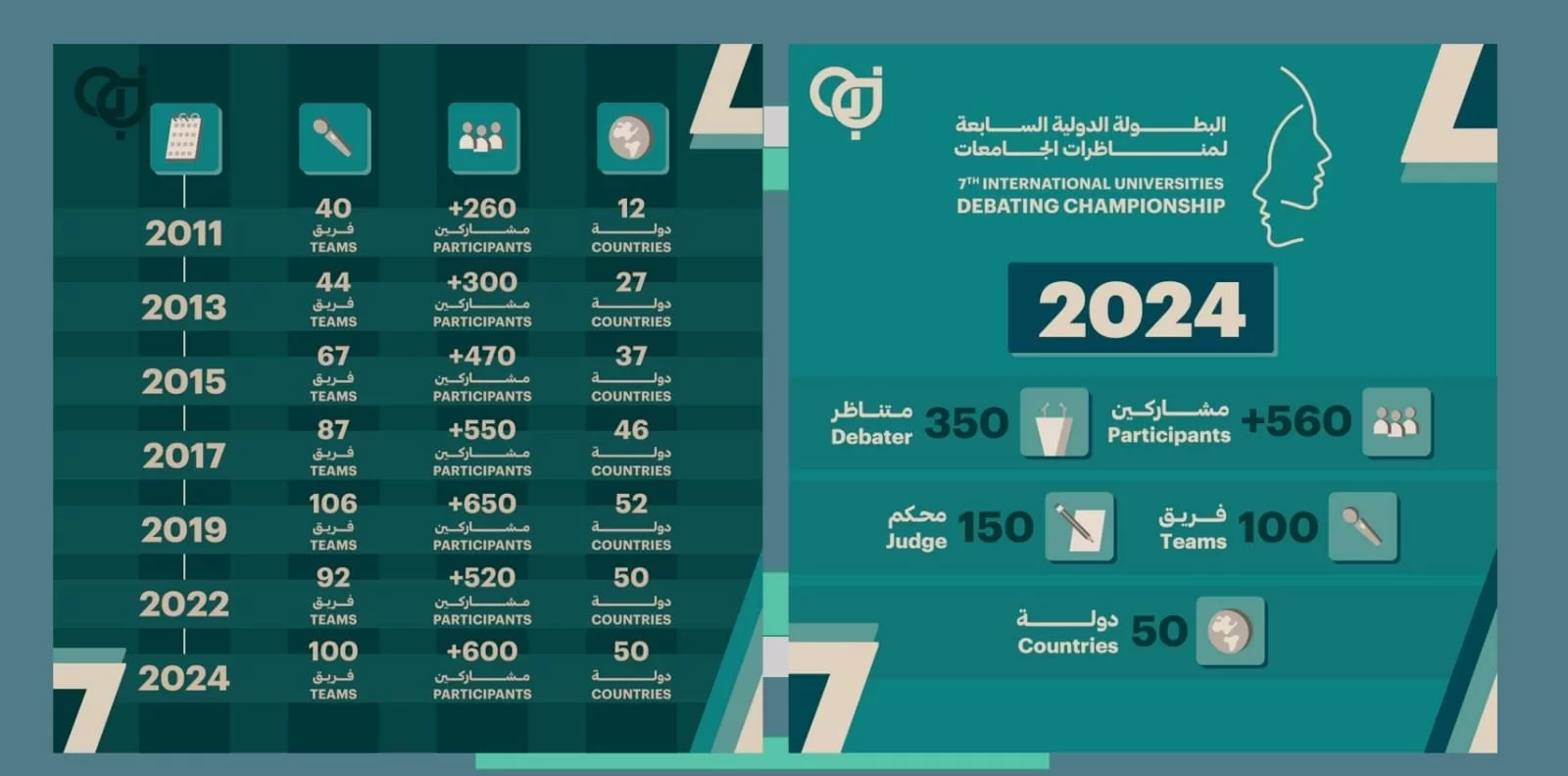 يشارك فريق جامعة طرابلس في البطولة الدولية السابعة لمناظرات الجامعات والتي تقام في الدوحة بدولة قطر. يشارك في هذه البطولة اكثر من 600 مشارك، بمعدل 100 فريق من واقع 50 دولة. وتاتي مشاركة فريق جامعة طرابلس بعد تأهله في التصفيات المحلية التي نظمت بمدينة مصراته بالشراكة مع مركز مناظرات قطر مطلع العام ا