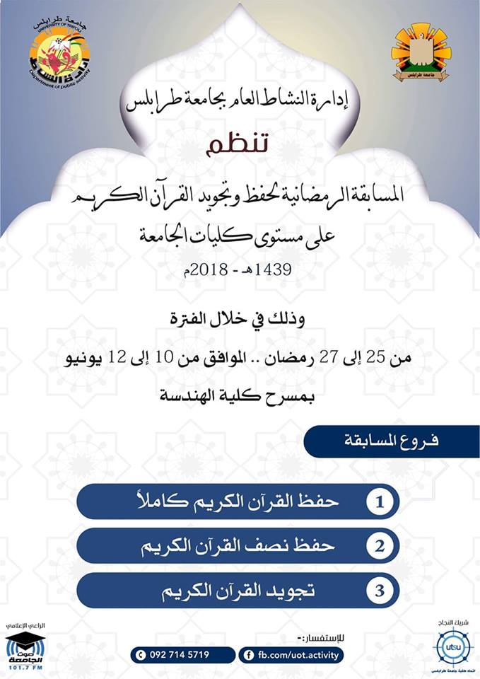 أعلنت إدارة النشاط العام بجامعة طرابلس، بأنه سيقام حفل تكريم وتوزيع الجوائز المالية للفائزين في المسابقة الرمضانية الثنية لحفظ وتجويد القرآن الكريم، خلال الفترة القريبة القادمة. وحصل الفائزون في المسابقة على جوائز مالية تعد من الأكثر قيمة في مسابقات حفظ وتجويد القرآن على مستوى الجامعات الليبية، ف
