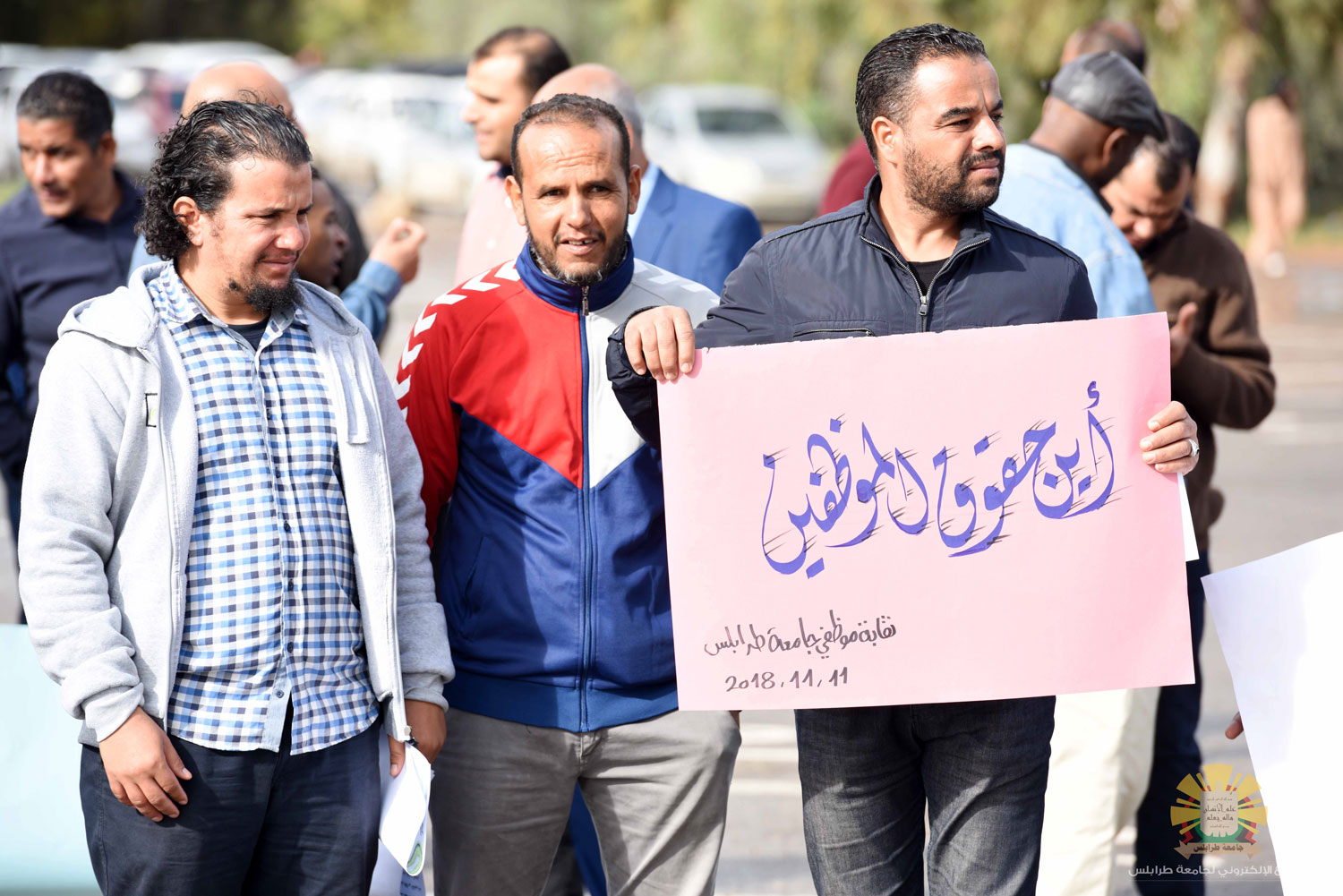 نظمت نقابة موظفي جامعة طرابلس وقفة احتجاجية صباح اليوم الاحد الموافق للحادي عشر من نوفمبر 2018 داخل الجامعة، حيث تجمع الموظفين في الساحة يحملون لافتات تطالب بزيادة المعاشات ووضع قرارات حاسمة تضمن حق الموظفين بصفتهم محور العملية التعليمية داخل الجامعة.