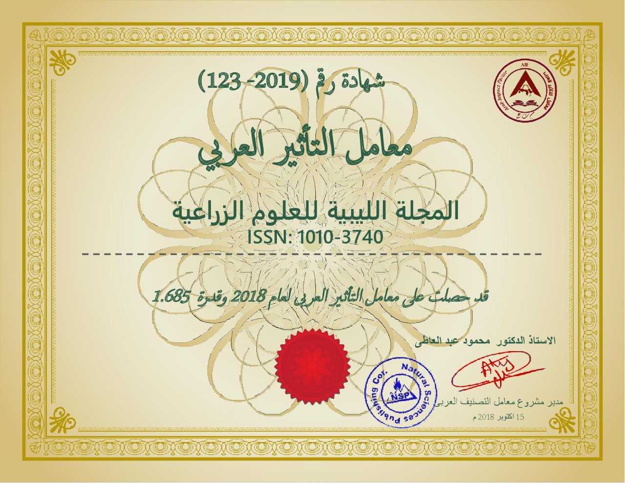 وللمرة الثانية على التوالي تتحصل المجلة الليبية للعلوم الزراعية شهادة معامل التأثير العربي