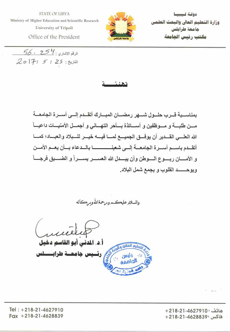 بمناسبة قرب حلول شهر رمضان المبارك أتقدم إلى أسرة الجامعة من طلبة و موظفين و أساتذة بأحر التهاني و أجمل الأمنيات داعياً الله العلي القدير أن يوفق الجميع لما فيه خير للبلاد والعباد؛ كما أتقدم باسم أسرة الجامعة إلى شعبنــــــــــــا بالدعاء بأن يعم الأمن و الأمان ربوع الوطن وأن يبدل الله