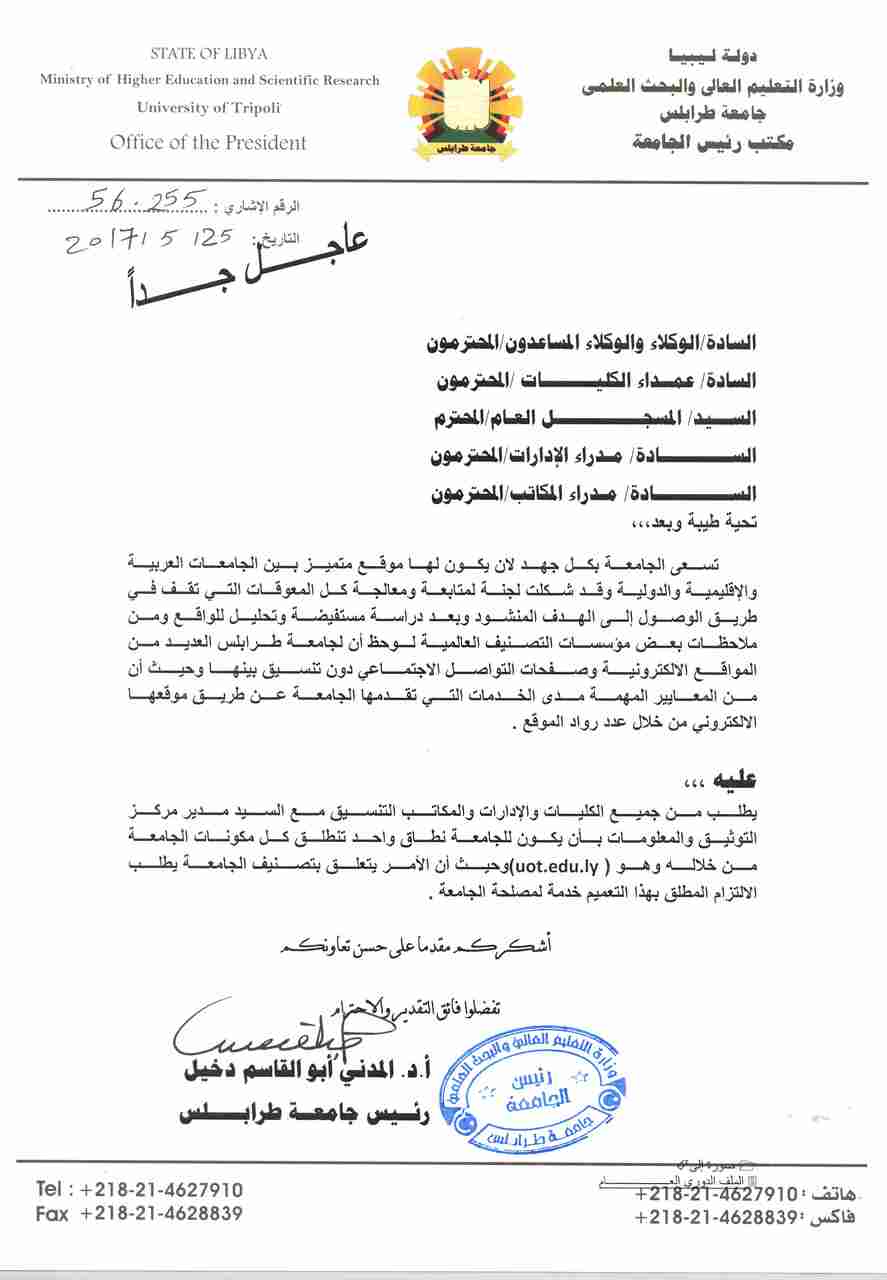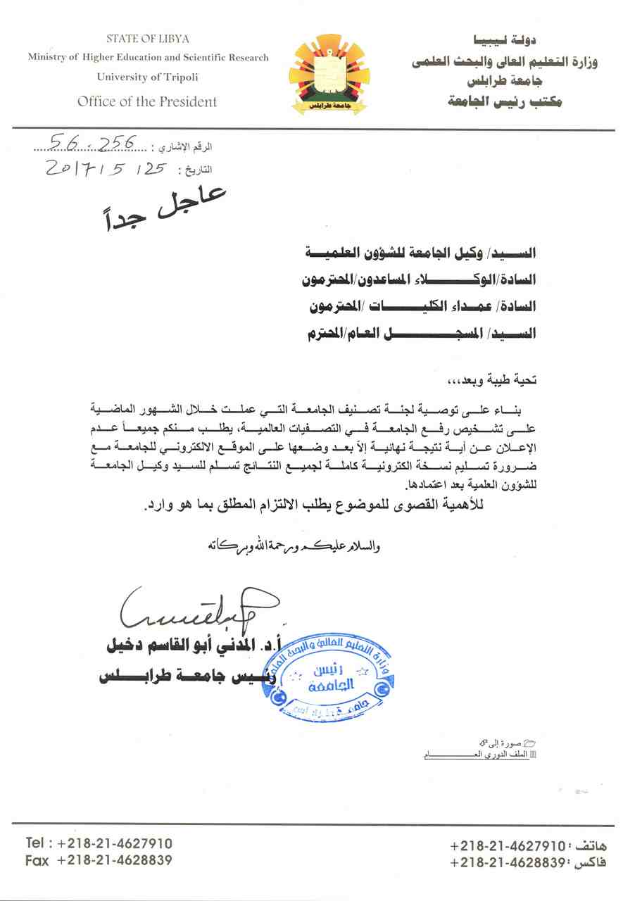 نفيدكم علما بتأجيل الامتحانات النصفية والنهائية بكافة الأقسام العلمية بجامعة طرابلس وذلك الي حين إشعار اخر