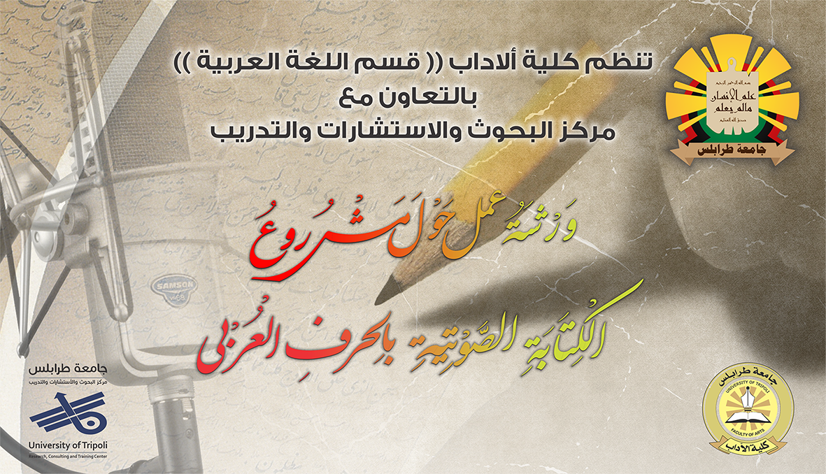 ينظم قسم اللغة العربية بكلية الآداب وبالتعاون مع مركز البحوث والاستشارات والتدريب يوم الاثنين (2017.02.13) ورشة عمل حول مشروع الكتابة الصوتية بالحرف العربي.. الورشة يحتضنها مدرج مالك بن نبي بجامعة طرابلس، ويشارك في ورشة العمل كوكبة من المختصين في اللسانيات، وبرنامج الورشة يبدأ بتقديم موجز عن مقتر