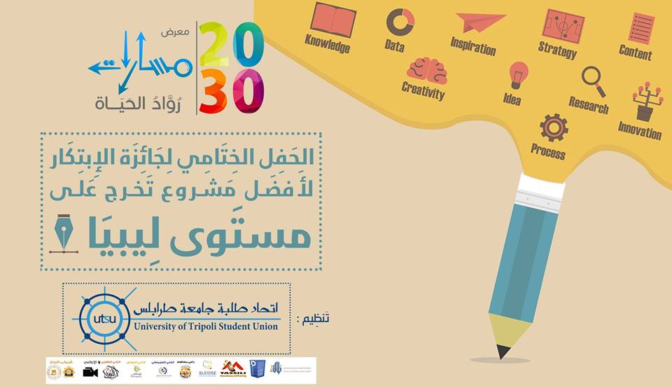 في إطار مساعي اتحاد طلبة جامعة طرابلس لتوجيه الشباب نحو بدء مشاريع خاصة بهم تعود بالنفع عليهم وتكون ذات نفع وخدمة للمجتمع.. أختار اتحاد طلبة جامعة طرابلس عدد (7) مشاريع مميزة ستكون حاضرة في (معرض مسارات رواد الحياة 2030).. وسيتم التعريف بهذه المشاريع، وسيطلع زوار المعرض على قصة نجاح تلك المشاريع،