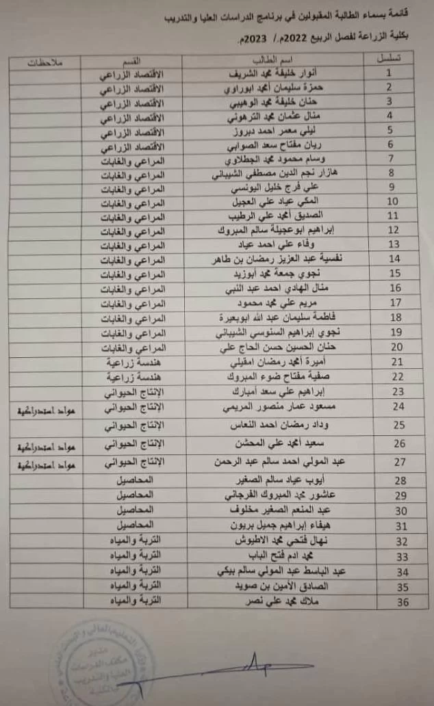 يُعلن مكتب الدراسات العُليا والتدريب بكلية الزراعة - جامعة طرابلس عن نتيجة امتحان القبول والمفاضلة لطلبة الدراسات العُليا للفصل الدراسي "خريف 2023 - 2024 م".تمنياتنا لأبنائنا الطلبة بالتوفيق والسداد