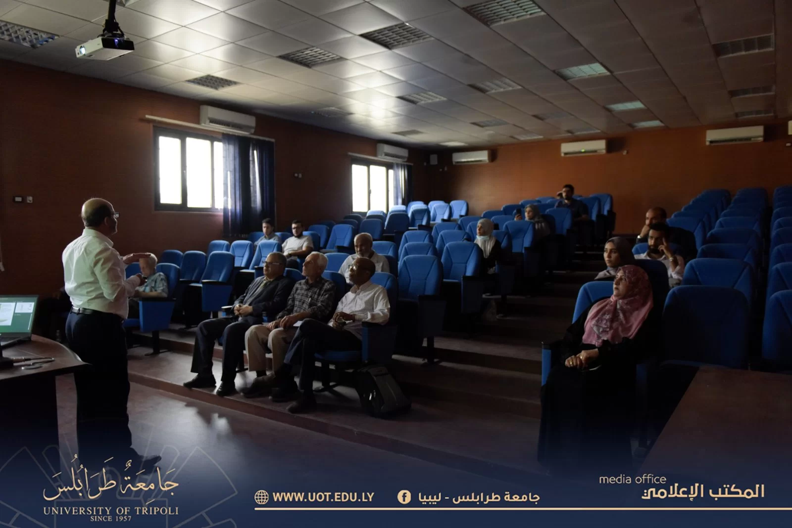 أُقيمت صباح اليوم الأحد الموافق 4 يونيو 2023 م بمدرج رشيد كعبار - جامعة طرابلس ورشة عمل بعنوان "مهارات العرض والإلقاء الأكاديمي" المُقامة من قِبل مركز البحوث والإستشارات والتدريب بجامعة طرابلس بإشراف السيد د. على عمر رمضان، حيث حضر الورشة عدد من أعضاء هيئة التدريس وطلبة الدراسات العُليا من داخل و