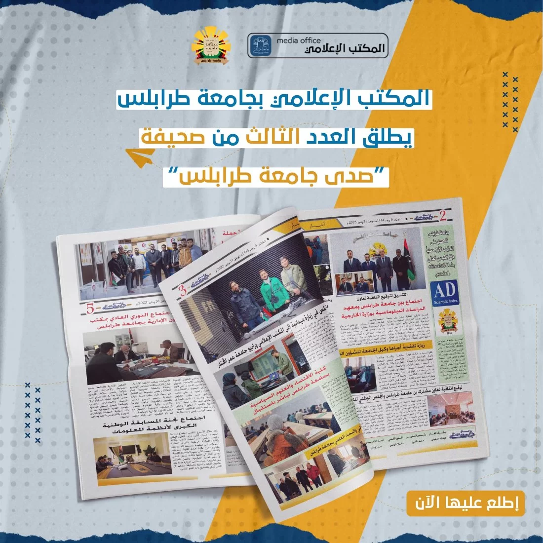 المكتب الإعلامي بجامعة طرابلس يُطلق العدد الثالث بعد الصفر من صحيفة "صدى جامعة طرابلس" للاطلاع على العدد يرجى الضغط على الرابط المُرفق أدناه. https://bit.ly/sada-uot3