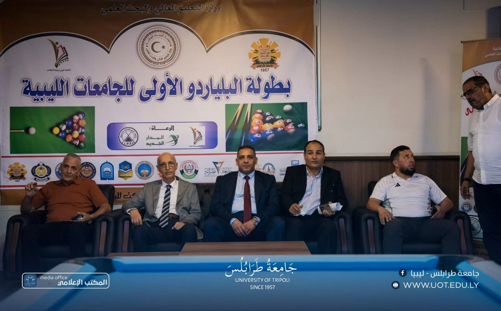 أقيمت صباح اليوم الأحد، الموافق 27 يوليو 2025 م، مراسم افتتاح بطولة البلياردو الأولى للجامعات الليبية. شهدت المراسم حضور السيد أ.د. خالد عون، رئيس جامعة طرابلس، والسيد د.علي مصدق وكيل الشؤون الطلابية والسيد د. محمد دبنون، مدير إدارة النشاط الجامعي بوزارة التعليم العالي والبحث العلمي، والسيد أ. طلال
