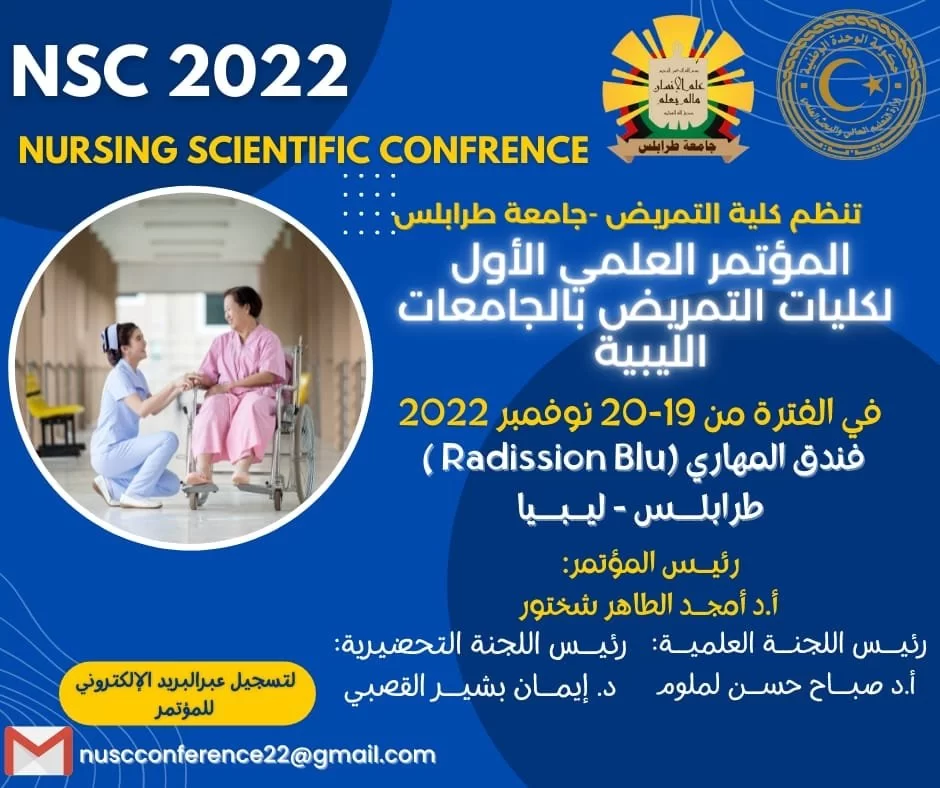 تعتزم كلية التمريض بجامعة طرابلس تنظيم المؤتمر العلمي الأول لكليات التمريض بالجامعات الليبية، وذلك في الفترة من 19-20 نوفمبر 2022م بفندق المهاري ( Radission Blu )