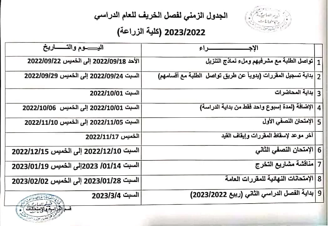 تعلن كلية الزراعة بجامعة طرابلس عن الجدول الزمني لفصل الخريف للعام الدراسي (2022-2023) تمنياتنا لطلبتنا الأعزاء بالتوفيق و النجاح.