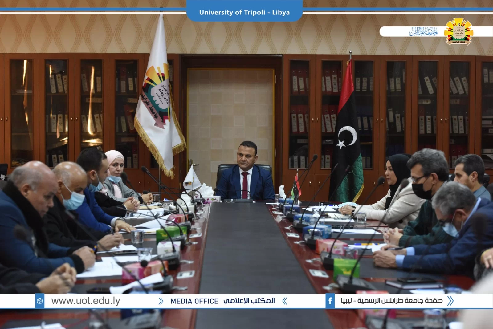 مجلس جامعة طرابلس يعقد إجتماعه الأول للعام 2022م.طرابلس 03 يناير 2022م.عقد صباح اليوم الإثنين بقاعة الإجتماعات الإجتماع الأول لمجلس جامعة طرابلس للعام 2022م برئاسة السيد أ.د. خالد عون رئيس جامعة طرابلس وبحضور السادة وكلاء الجامعة والسيد الكاتب العام بالجامعة والسيد المسجل العام بالجامعة والسادة عمدا