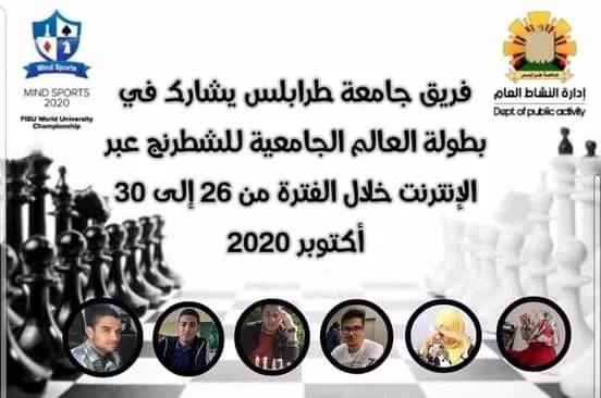 تحت إشراف إدارة النشاط العام بجامعة طرابلس وبرعاية الاتحاد الليبي لرياضة الطلاب، يشارك فريق جامعة طرابلس في بطولة العالم الجامعية للشطرنج والتي ينظمها الاتحاد الدولى للرياضة الجامعية عبر الإنترنت خلال الفترة من 26 إلى 30 أكتوبر المقبل.يُشار إلى أن إدارة النشاط العام تسعى لإتاحة الفرصة لطلاب ال