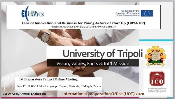 شارك مكتب التعاون الدولي بجامعة طرابلس اليوم الأربعاء، في الاجتماع التأسيسي لمشروع Libya Up ،والذى يُعنى برفع كفاءة مؤسسات التعليم العالي في مجال ربط الأوساط الأكاديمية والبحثية بسوق العمل، ويذكر أن هذا المشروع يأتي من ضمن المشاريع المدعومة من الاتحاد الاوروبي .