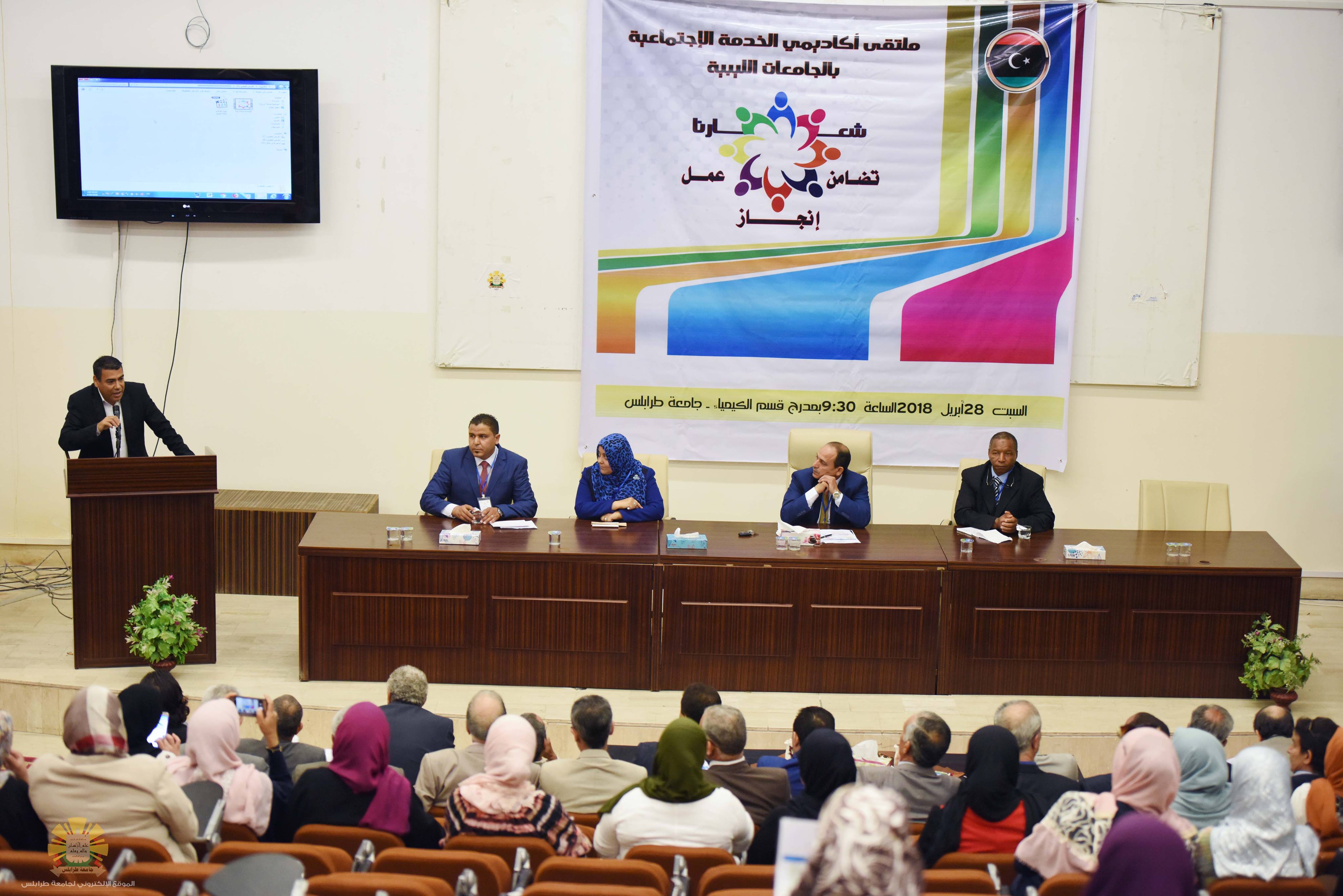 The first meeting of the social service academics in the Libyan universities was held at the stand of Chemistry Department - University of Tripoli, under the theme (solidarity - work - achievement) The seminar was attended by Vice-Dean for Scientific Affairs Dr. Mabrouk Faris, U