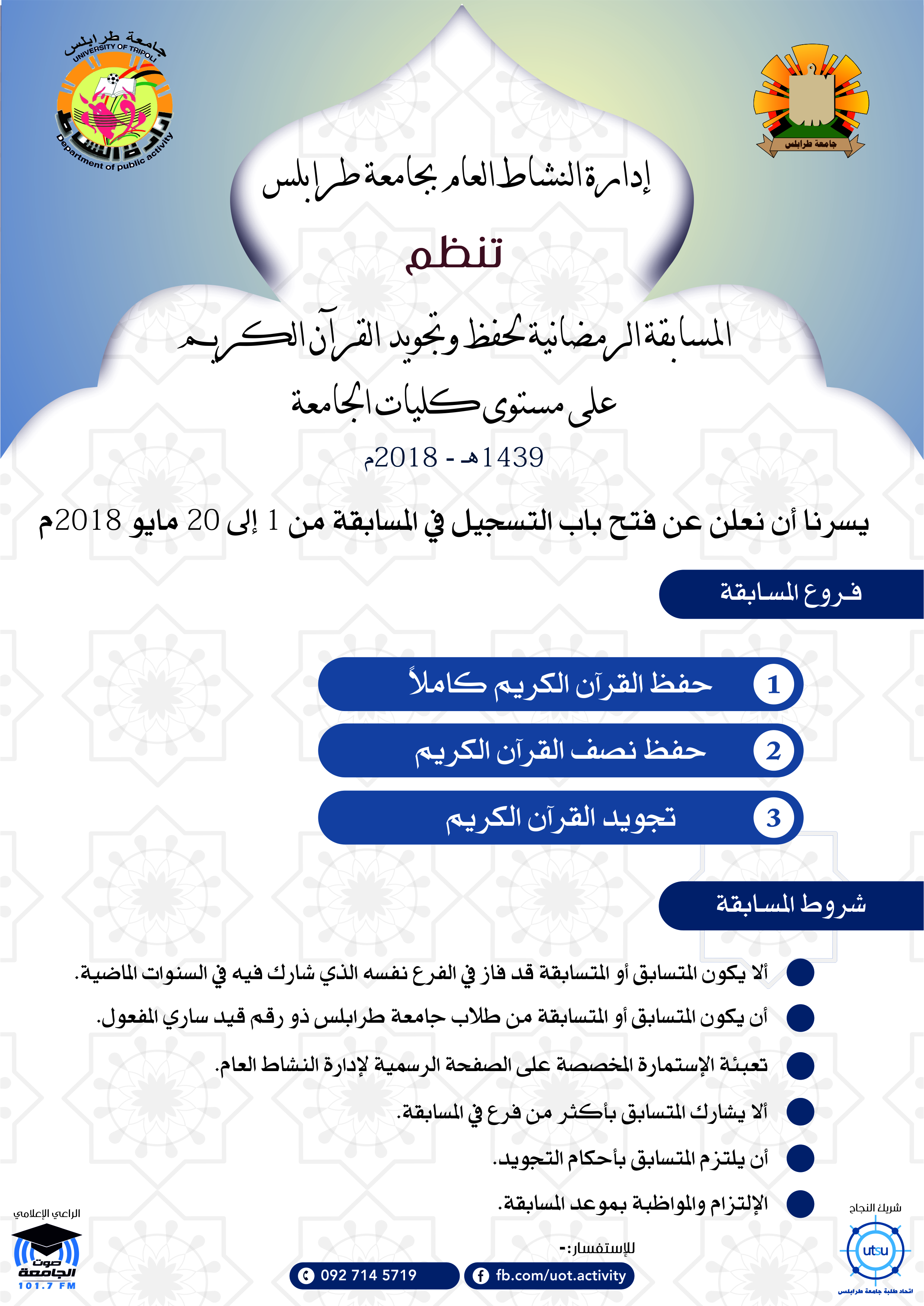 On the occasion of the coming Holy Month of Ramadan, the Department of Public Activity at the University of Tripoli is pleased to announce the opening of the registration for the second Ramadan competition for memorizing and reciting the Holy Quran at t