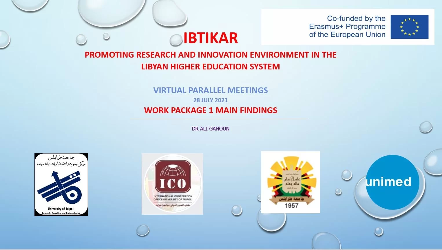 عقد صباح يوم الاربعاء 28-7-2021م عبر تطبيق الزوم الاجتماع التقابلى لجميع شركاء مشروع IBTIKAR , حيث حضر الاجتماع من جانب جامعة طرابلس كل من د.مدير مكتب التعاون الدولى و د. مدير مركز البحوث والاستشارات والتدريب بالجامعة. تدارس المجتمعون حزمة العمل المناطة بكل شريك من الشركاء. وقد قدمت جامعة طرابلس تقريرها فيما يخص تقييم واقع مراكز البحوث والاستشارات والتدريب بالجامعات الليبية .الجدير بالذكر أن المشروع يجمع في شراكته عشر جامعات ليبية وثلاث جامعات أوروبية و يهدف لدعم مراكز البحوث والبحث العلمى بالجامعات الشريكة و هو ياتى ضمن مشاريع رفع القدرات ( ايراسموس بلس) ومدعوما من الاتحاد الاوروبي.