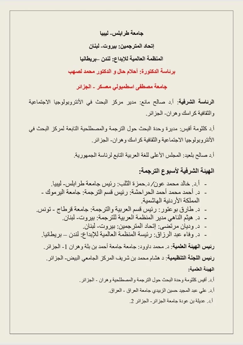 مشاركة جامعة طرابلس أحتفالية أسبوع الترجمة 24 سبتمبر لغاية 30 سبتمبر التى تنظمها وزارة التعليم و البحث العلمى الجزائرية