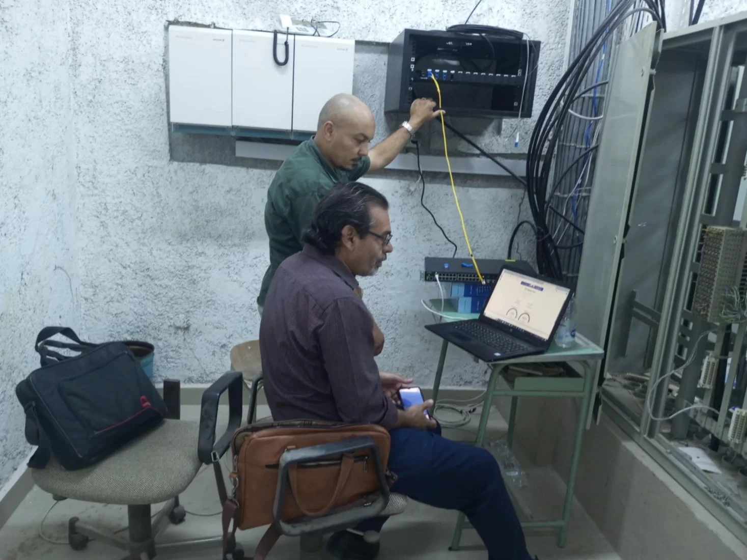 في إطار استكمال عمل الكليات والإدارات وتحسين جودة العمل، والتأكد من اتصال جميع أنحاء الجامعة بشبكة الإنترنت من قبل مهندسي وفنيي مركز التوثيق والمعلومات.قام المهندس طه مسعود بزيارة مكتب عميد كلية الطب البشري بجامعة طرابلس للكشف على حالة الإنترنت. بعد الفحص، تبين وجود قطع في الكابل الموجود ب