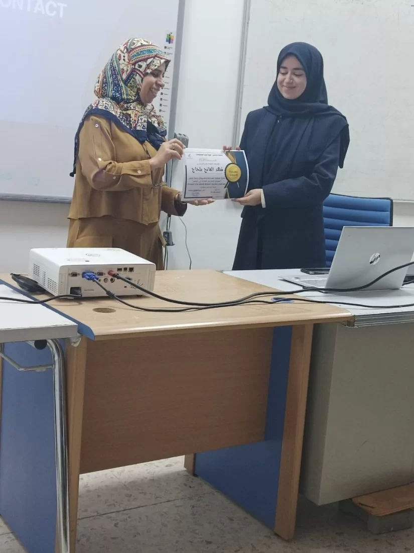 اقيمت صباح الاحد الموافق 1\6\2025 بالقاعة رقم "1" في كلية تقنية المعلومات ورشة عمل بعنوان "مشروع التخرج من الفكرة الى التنفيد", القتها المهندستان وخريجتا قسم الحوسبة المتنقلة, م.نورا ابوسالم وم.شهد بلحاج.