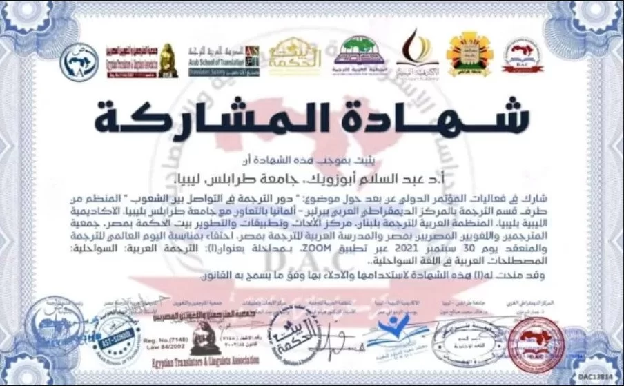 شارك كل من رئيس القسم أ. عبدالسلام عبدالله أبوزويك و عضو هيئة التدريس د. عبدالله ميلاد عقيل عن بعد في فعاليات المؤتمر الدولي للترجمة والمنعقد ببرلين بتاريخ 30 سبتمبر 2021 إحتفاءا بالبوم العالمي للترجمة، بمداخلة بعنوان "الترجمة العربية السواحلية: المصطلحات العربية في اللغة السواحلية. عبر تطبيق الزووم.