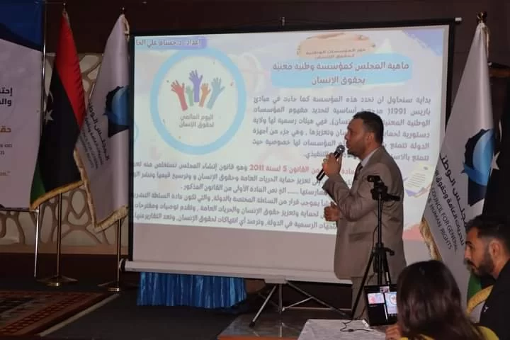 Dr. Hossam Al-Hajj, Vice Dean of the College of Law and a faculty member in the Department of Public Law, participated Monday morning in a scientific paper on International Human Rights Day entitled. (The relationship between the authorities and the Human Rights Council in Libya) The cele