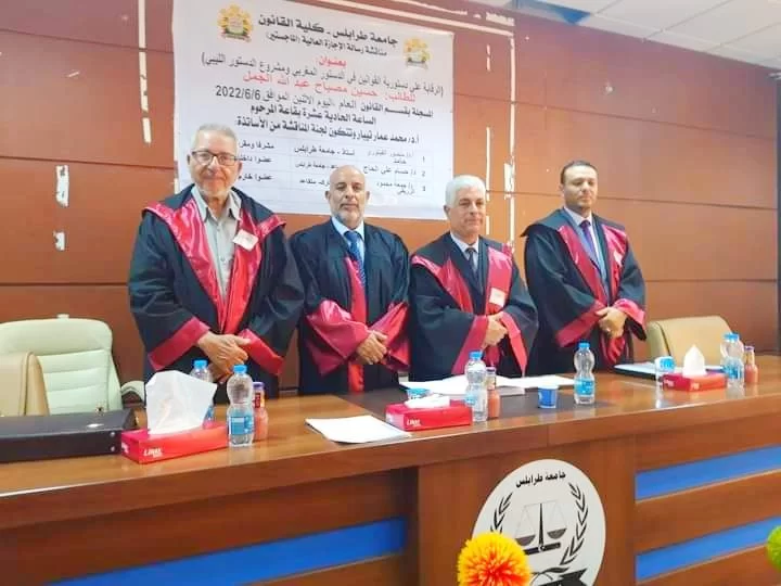 بقاعة المؤتمرات بكلية القانون نوقشت صباح اليوم رسالة الاجازة العالية " الماجستير " في القانون العام المنجزة من الطالب حسين مصباح الجمل ،،،.بعنوان: - " الرقابة على دستورية القوانين في الدستور المغربي ومشروع الدستور الليبي"و بعد مناقشة الطالب و المداولة بين أعضاء اللجنة ،، تقرر إجازة