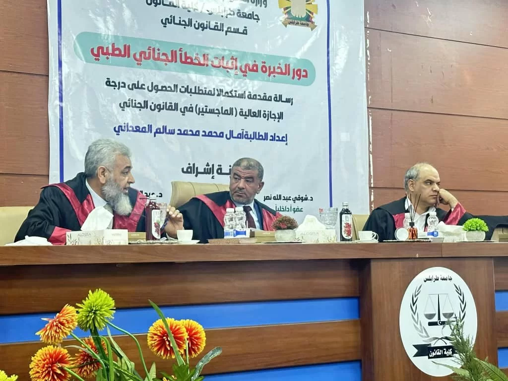 في قاعة الاجتماعات بالمبنى الإداري لكلية القانون، تم صباح اليوم الأربعاء الموافق 26 نوفمبر 2025، مناقشة رسالة ماجستير للطالبة أمال محمد محمد المعداني بقسم القانون الجنائي، والتي حملت عنوان:"دور الخبرة في إثبات الخطأ الجنائي الطبي".وقد أجيزت الرسالة من قبل اللجنة العلمية بعد مناقشة مستفيضة