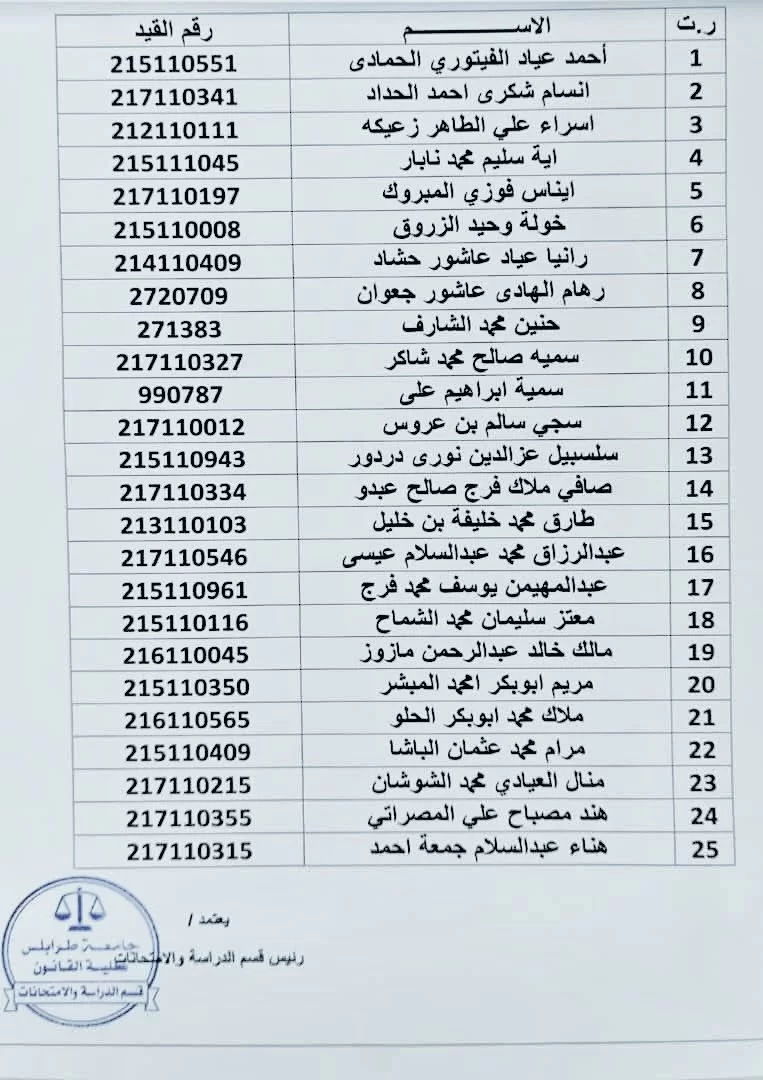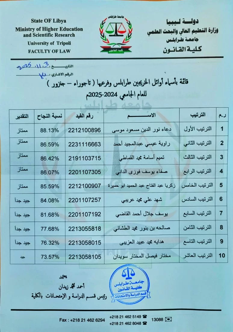 أعلنت إدارة كلية القانون مساء اليوم الاثنين 3 نوفمبر 2025م، عن قائمة أوائل الطلبة في السنوات الدراسية الأولى، الثانية، الثالثة، والرابعة للعام الجامعي 2024 / 2025م، إلى جانب الإعلان عن أوائل الخريجين بفَرعي جنزور وتاجوراء.يأتي هذا الإعلان تتويجًا لمسيرة من الجدّ والاجتهاد والتفوق العلمي، و