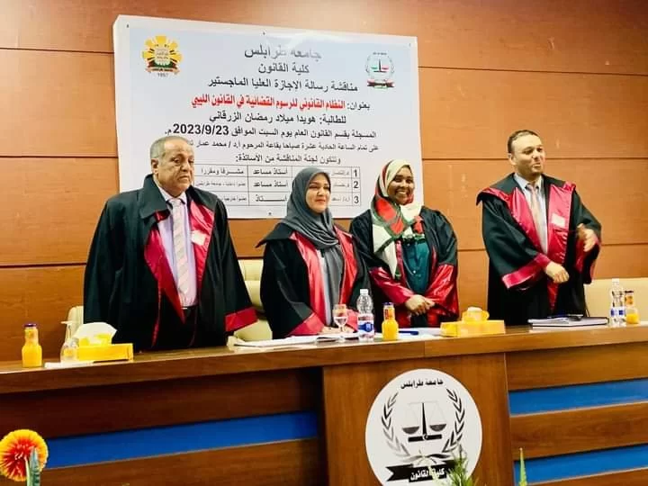 نوقشت صباح اليوم السبت الموافق 2023.09.23م رسالة ماجستير بقسم القانون العام، للطالبة هويدا ميلاد الزرقاني، بعنوان ((النظام القانوني للرسوم القضائية في القانون الليبي)).