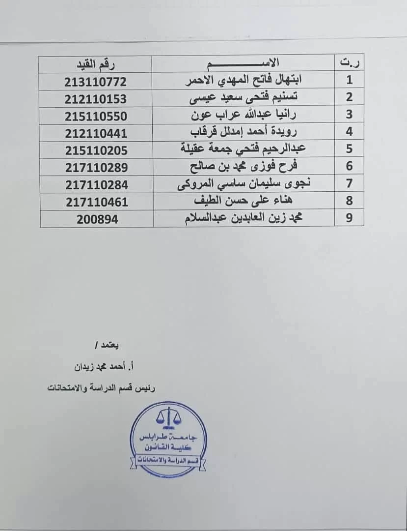 أعلن قسم الدراسة والامتحانات بكلية القانون – جامعة طرابلس، عن اعتماد وإصدار قائمة خريجي برنامج نظام الفصل خريف 2024. وقد شملت القائمة (34) طالبًا وطالبة أنهوا مقرراتهم الدراسية واجتازوا جميع المتطلبات الأكاديمية المقررة لنيل درجة الليسانس في القانون.