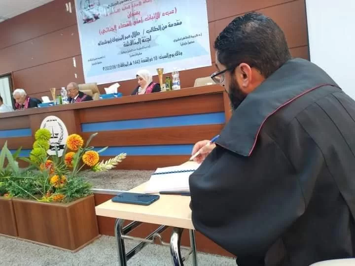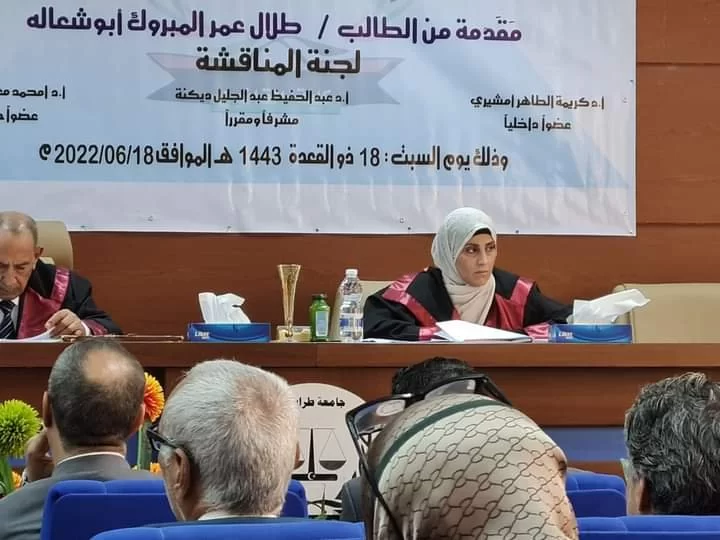 In the administrative building of the Faculty of Law, a public session was held this morning to discuss the master's thesis in criminal law submitted by the student Talal Omar Abu Shaala, tagged: -